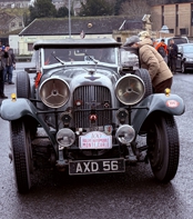 braving the weather in their 1934 Lagonda, sporting a hood but no